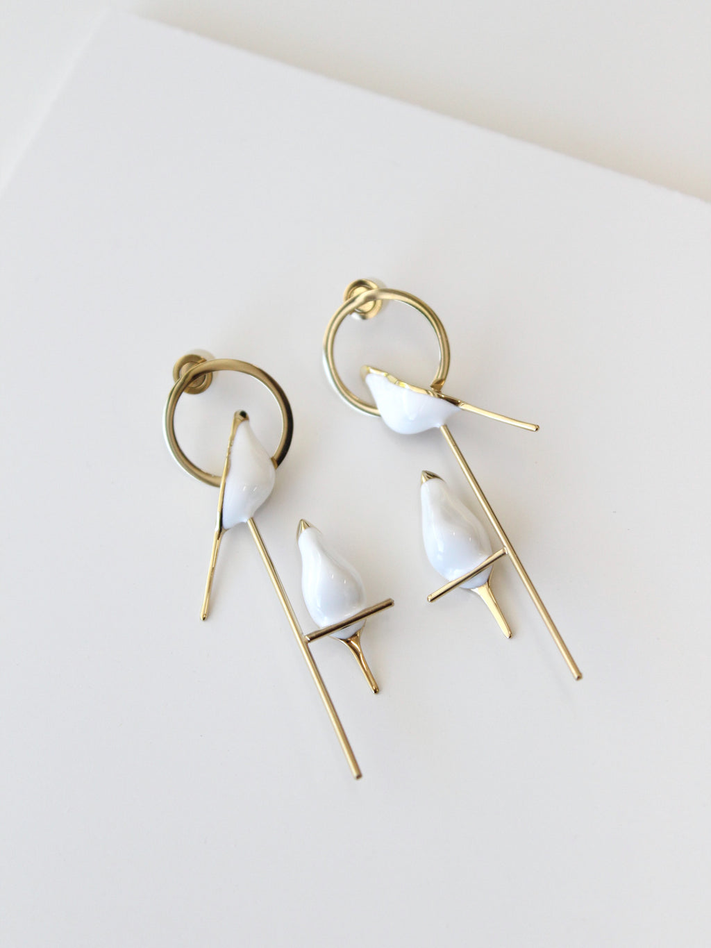 The Perched Bird Earrings feature delicately balanced birds perched on a ledge — a subtle nod to vintage design, reimagined with a modern, architectural twist.