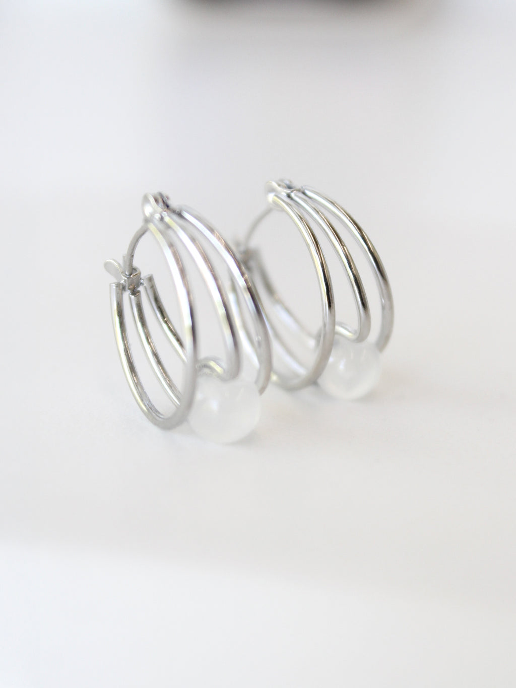 Presa Hoops: vintage lighting inspired hoops joined by a glowing white jade orb, designed with a backless closure for a secure, modern fit