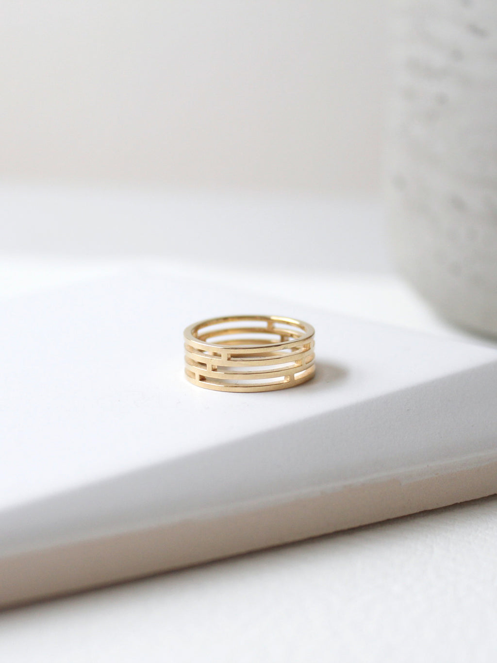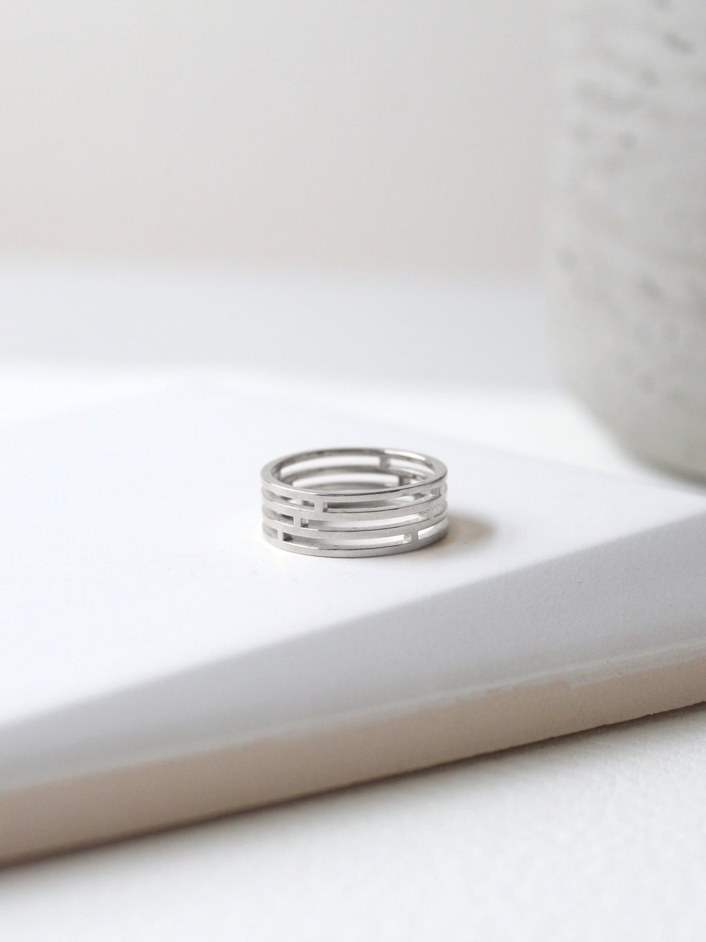 Introducing the Tile Ring, a beautifully designed ring that draws inspiration from the clean lines and timeless appeal found in suburban homes. This ring features an intricate tile pattern that goes beyond traditional ceramic tiles and extends to other elements of modern architecture, including vertical wood siding, flooring, and exposed ceilings. This design captures the essence of contemporary simplicity, making it a captivating piece that resonates with lovers of modern design.